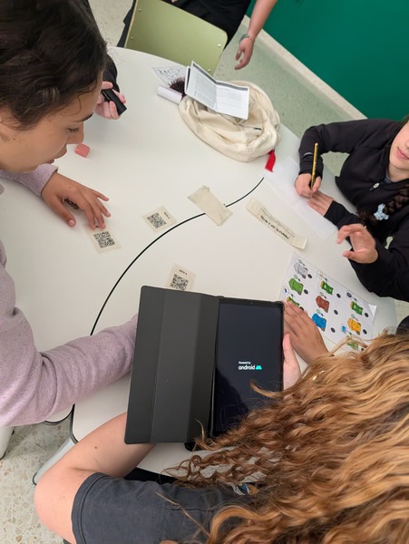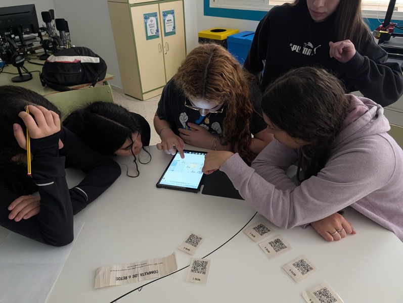 Después comenzaba el reto: Por el instituto había repartidas fichas con forma de hexágono, cada una con una operación. El alumnado, en equipos, tenía que ir a por una ficha, volver al aula, resolver la operación y comprobar si el resultado coincidía con el número central. Si era correcto, colocaban la pieza; Si no, dejaban la ficha y buscaban otra diferente.
